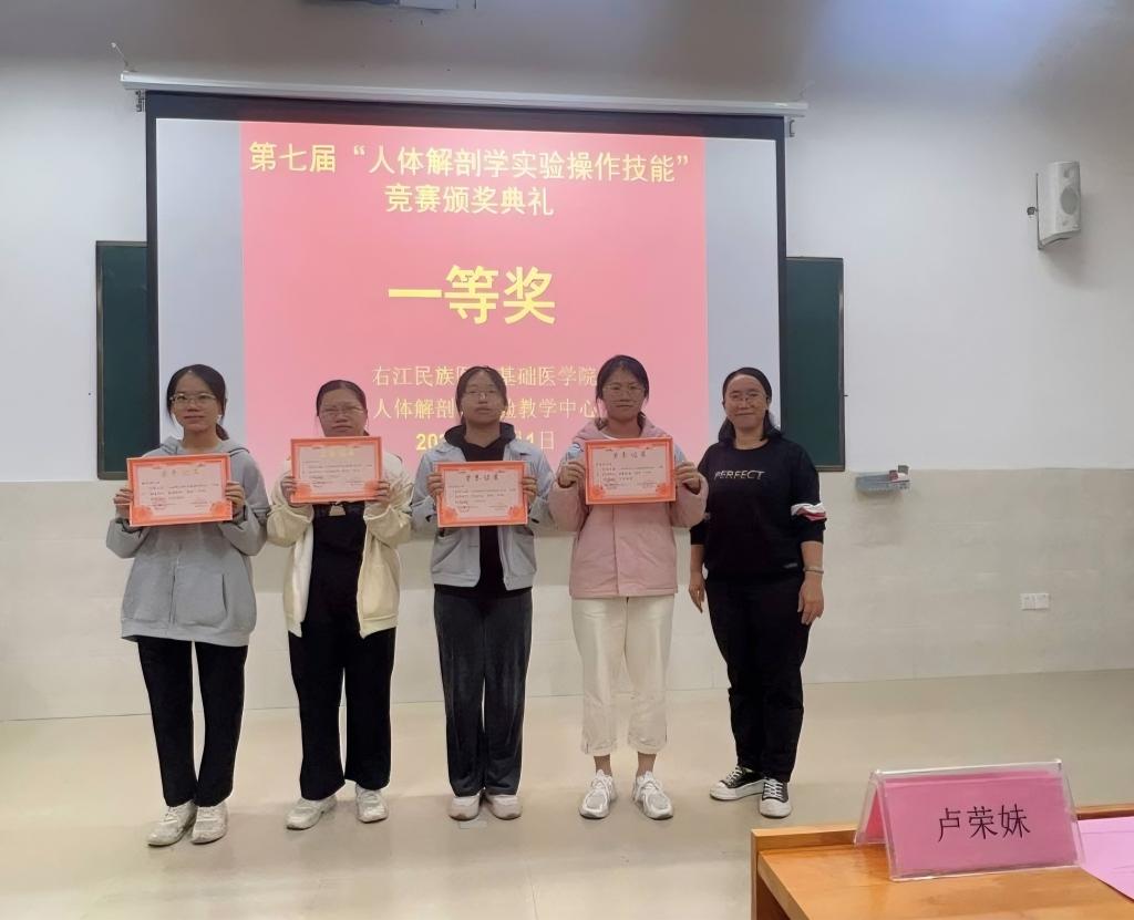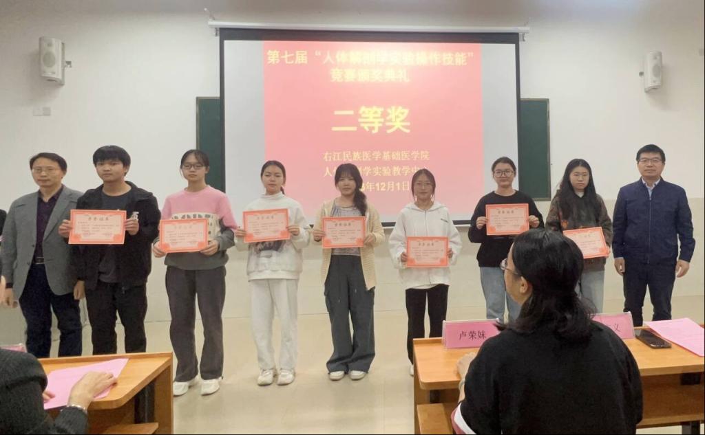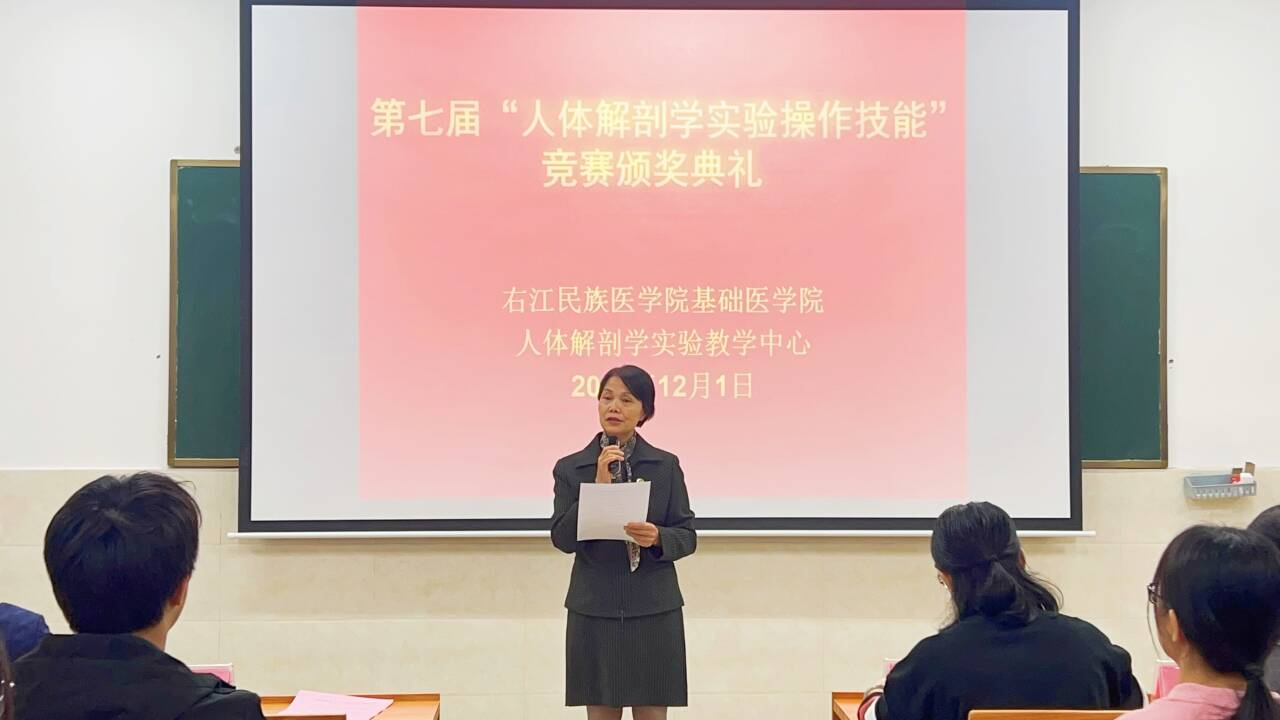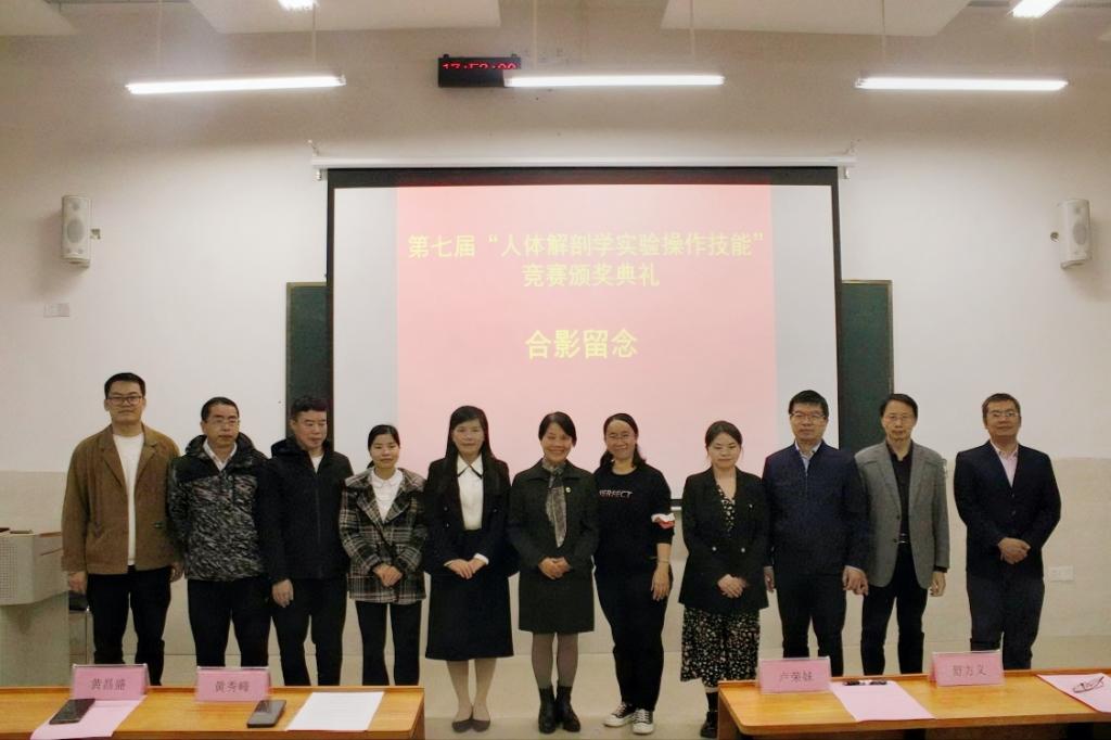 12月1日下午,由必威西汉姆联官网主办、人体解剖学实验教学中心承办的第七届“人体解剖学实验操作技能”竞赛颁奖仪式在百东校区守正楼C103教室隆重举行。必威西汉姆联官网党委副书记卢荣妹、人体解剖学实验教学中心主任黄秀峰教授、教育评价与教师发展中心舒方义副教授、人体解剖学实验教学中心副主任黄昌盛教授,人体解剖学教研室杨园园副教授、李克明副主任医师,人体解剖学实验教学中心全体教师以及参加本次竞赛获奖的学生参加颁奖典礼,颁奖典礼由杨照英老师主持。