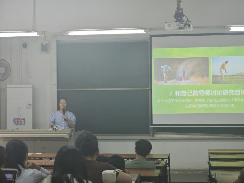 黄凌凌老师以提高科研效率的方法为引,教育引导同学们在科研的起步阶段,压力与机会并存,面对复杂的研究问题,会遇到难题和困惑,要学会适当请求帮助、加强团队协作、保持良好的生活习惯,以更好地应对学业压力。