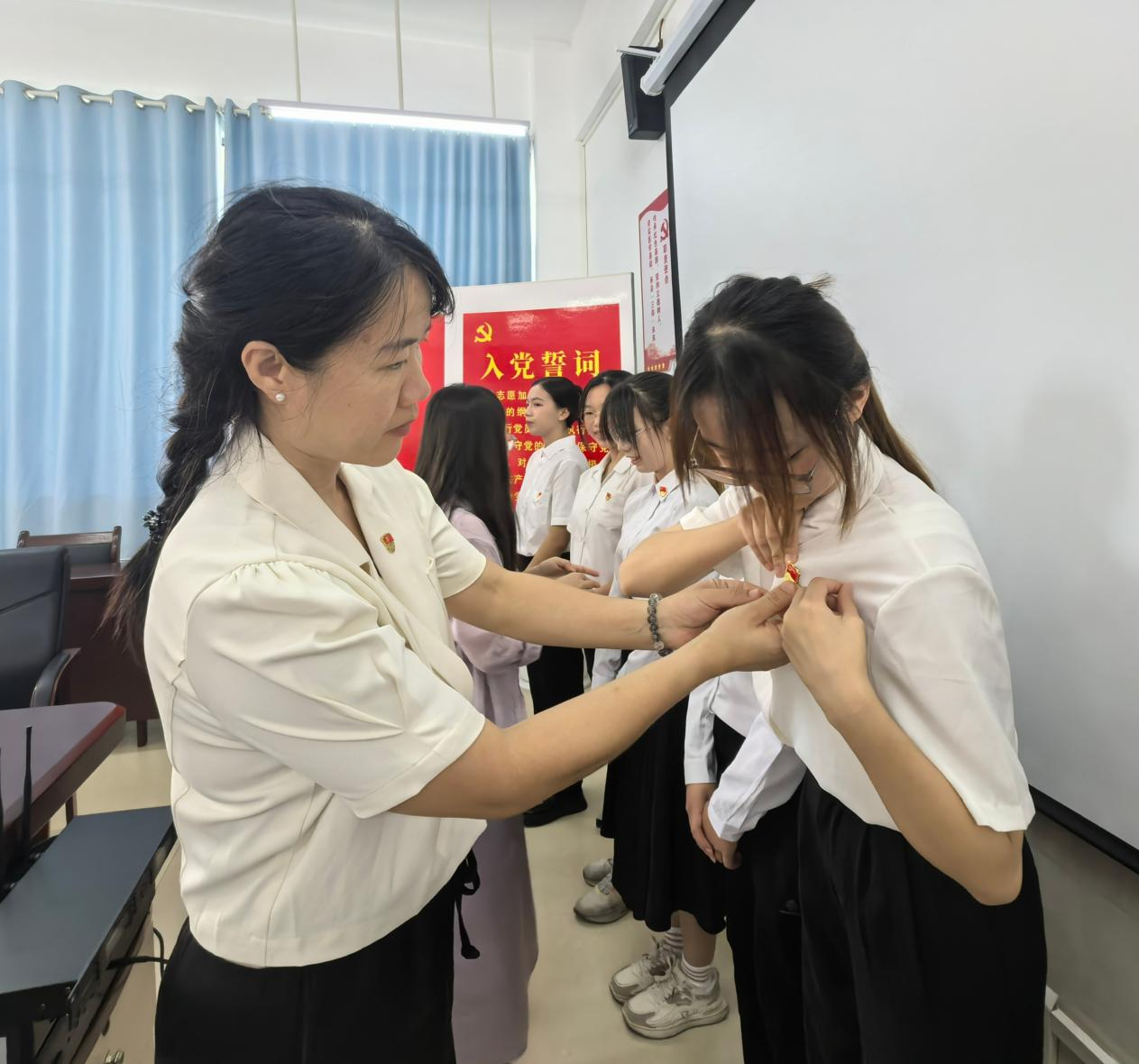 活动在庄严激昂的《国际歌》旋律中拉开序幕。党委书记宾晓芸与教师党员代表为新党员佩戴熠熠生辉的党员徽章,鲜红的徽章别在胸前,既是荣誉的象征,更是责任的嘱托,标志着新党员正式融入党的大家庭。