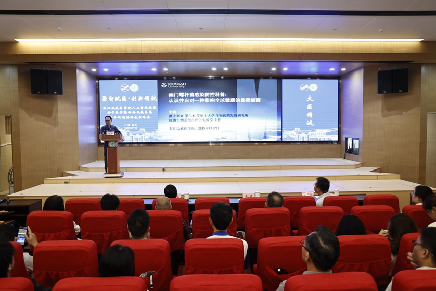7月7日,澳大利亚科学院院士李健教授受邀莅临右江民族医学院桂无幽科学家精神科普工作室,开展以《幽门螺杆菌感染防控科普》为主题的科普讲座,讲座由我校科技处处长、桂无幽科学家宣讲工作室负责人黄衍强教授主持。