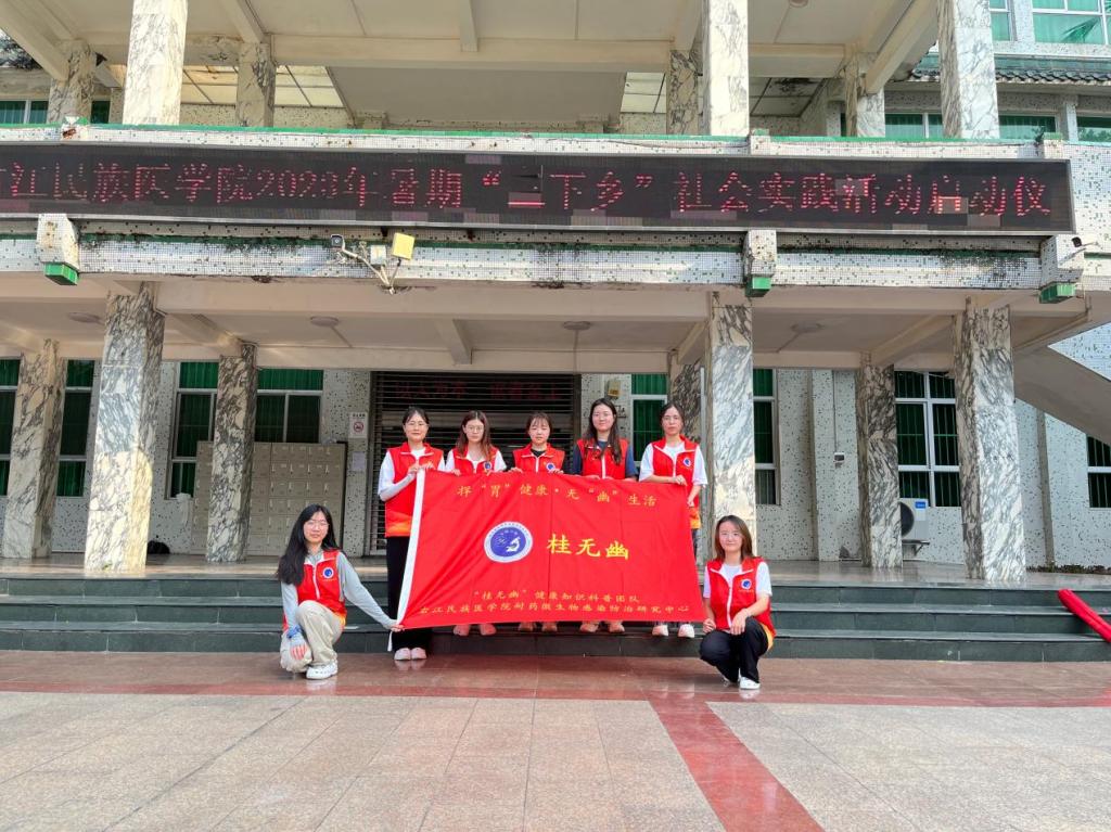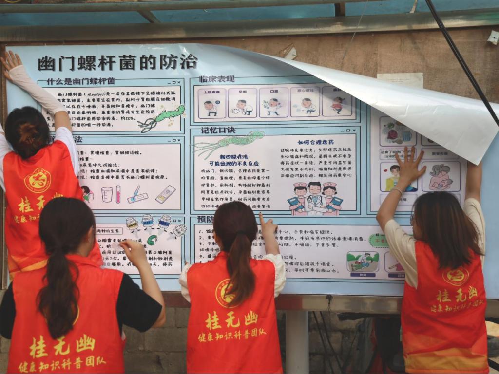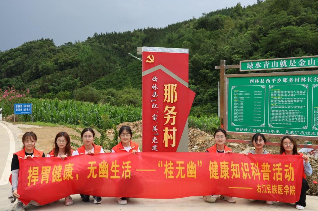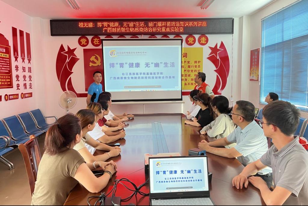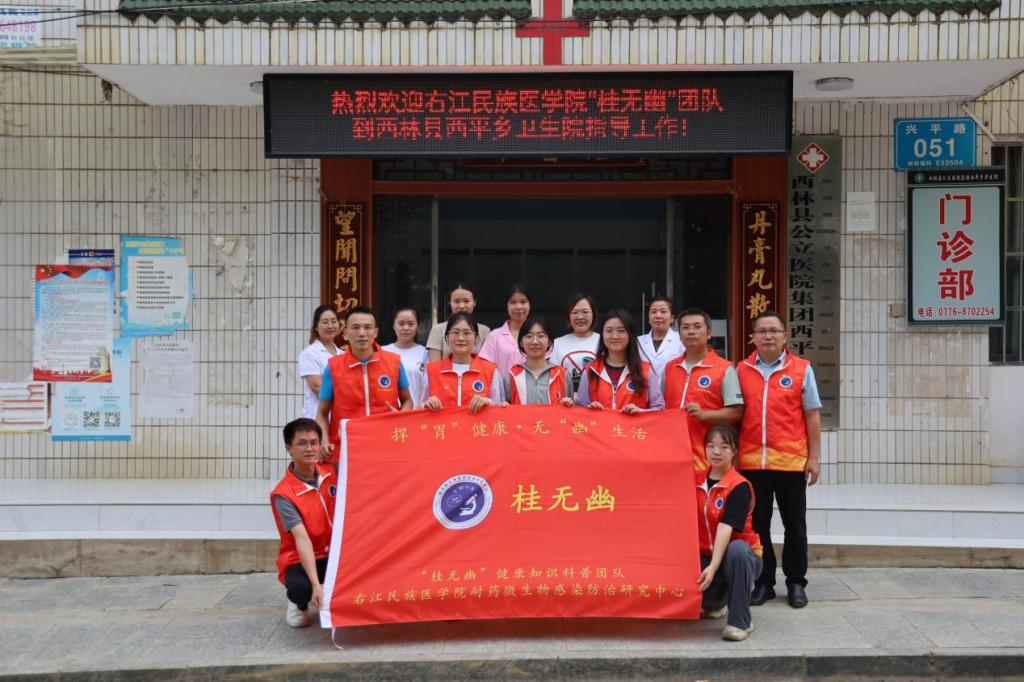 为提高大众对幽门螺杆菌的认知度,帮助大众树立正确的防范意识、做好防治措施,右江民族医学院必威西汉姆联官网广西高校耐药微生物感染防治研究重点实验室“桂无幽”科普团队7名成员前往西林县那务村,开展了以“老百姓‘捍胃除幽’好帮手,捍胃健康,无幽生活”为主题的公益科普活动。