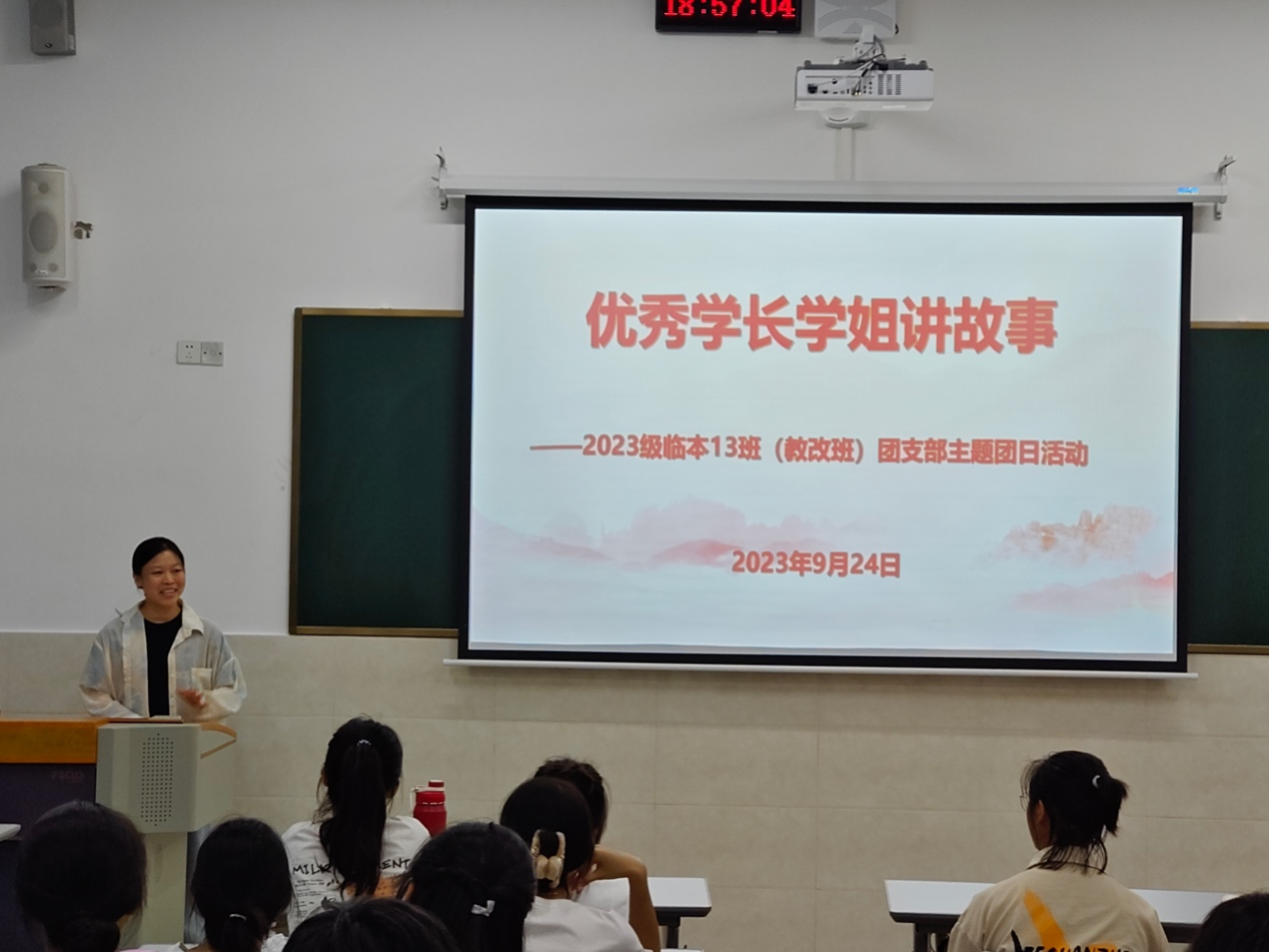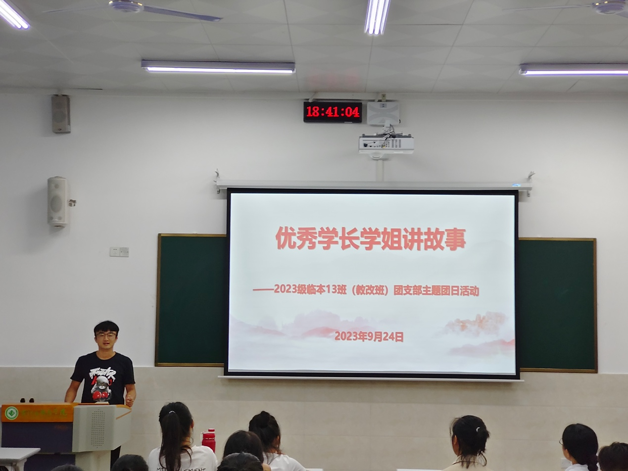 为使大一新生尽快适应大学的学习生活,增强同学们的自信心,激发同学们的学习热情,充分发挥榜样作用和做好传帮带作用,2023年9月24日晚上,2023级临床医学(教改班)邀请了我校正在实习的2019级临床医学(教改班)团支部书记韦文顺同学、党支部书记黄鸿同学到百东校区守正楼A403教室开展“优秀学长学姐讲故事”主题团日活动,2023级临床医学(教改班)全体同学参与了此次活动,活动由班长梁志阳同学主持。