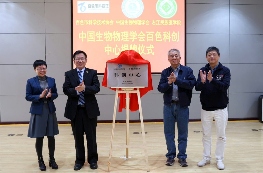 刘平生总干事长、吉永华教授、李雪斌校长、邓雅娜主席共同为“中国生物物理学会百色科创中心”揭牌。