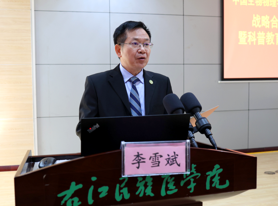 李雪斌校长在致辞时首先代表全校师生员工,向各位领导专家的到来表示热烈的欢迎,向各位领导专家长期以来给予我校的关心帮助和大力支持表示衷心的感谢。李雪斌校长指出,此次签约对于提高我校科技工作水平,促进学校高质量发展具有十分重要的意义。希望我校师生要进一步强化社会科普责任,提升科普能力建设,推动科普工作与科技创新协同发展,切实做到资源共享、优势互补、互利共赢,以服务求支持,以科技促发展,充分履行社会科普责任,为区域经济社会发展做出更大贡献,共同守护好祖国卫生健康的南大门。